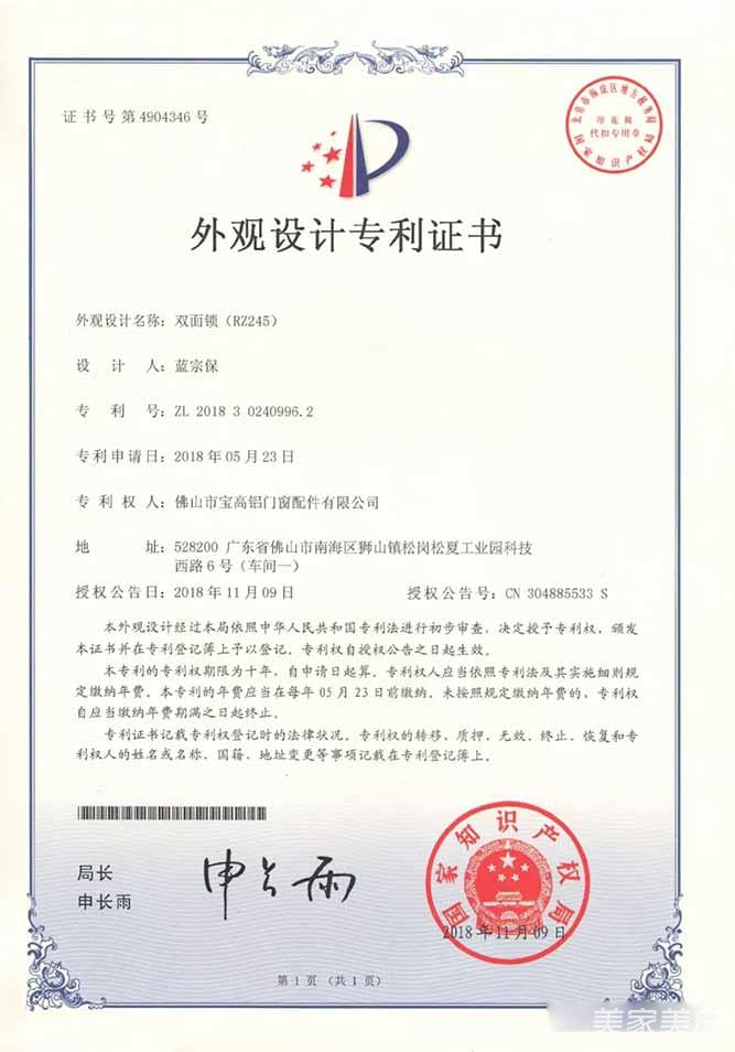 3、外观设计专利证书-双面锁(RZ245)