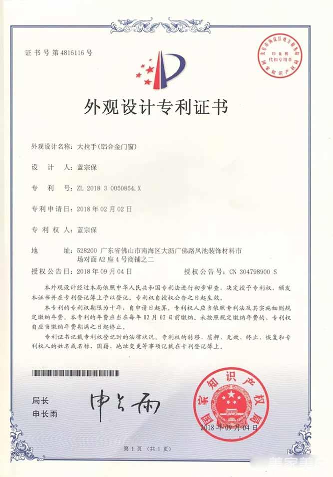4、外观设计专利证书-大拉手(铝合金门窗)