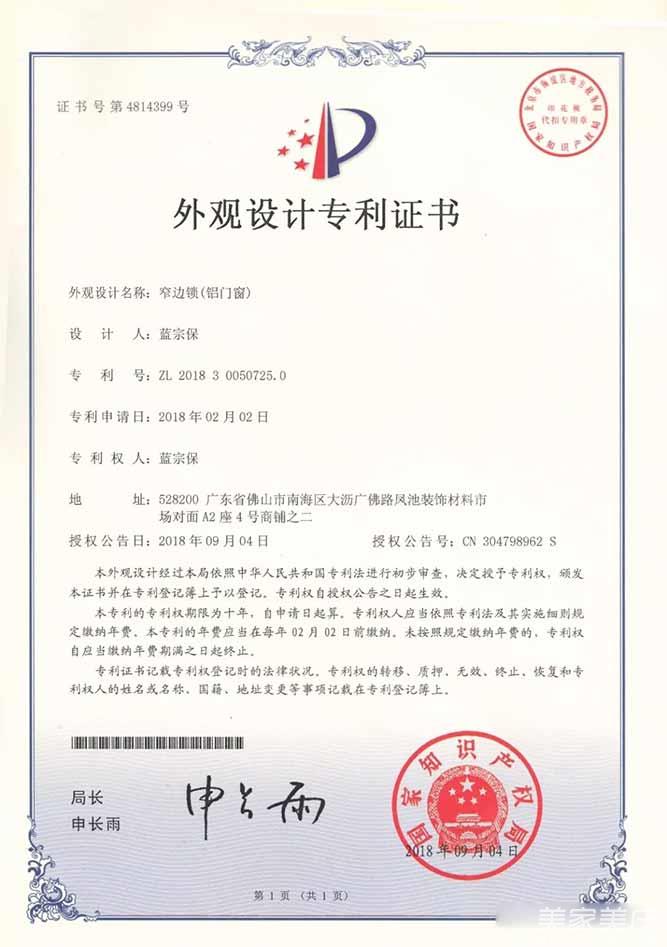 5、外观设计专利证书-窄边锁(铝门窗)
