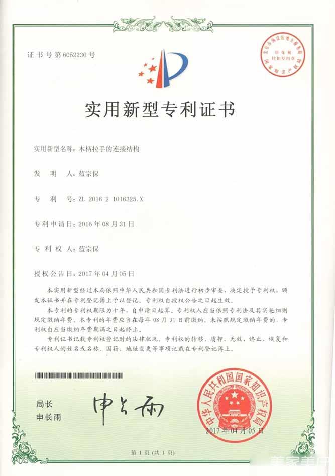 1、实用新型专利证书-木柄拉手的连接结构