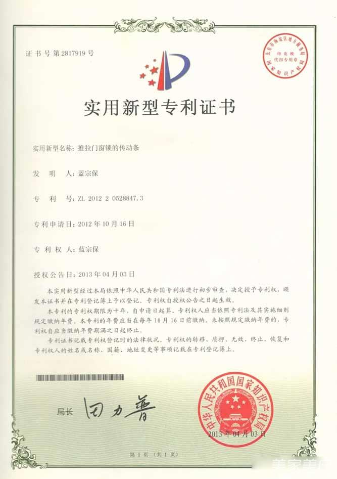 2、实用新型专利证书-推拉门窗锁的传动条
