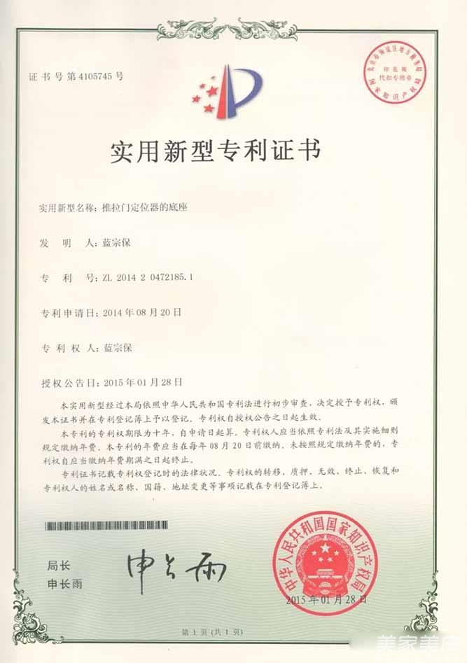 3、实用新型专利证书-推拉门定位器的底座