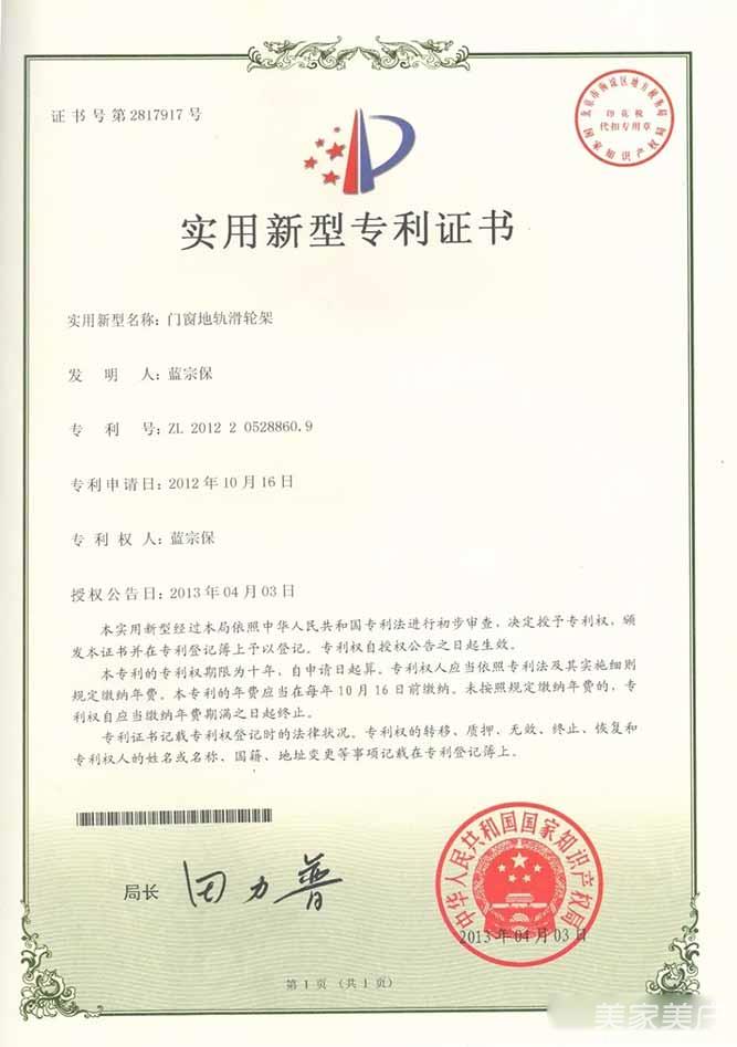 5、实用新型专利证书-门窗地轨滑轮架
