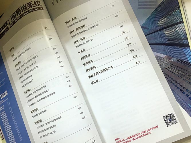 《中国门业·门窗幕墙系统》是立足于市场、连接门窗幕墙行业上下游产业链,并渗透终端的行业专业刊物,充分发挥信息交流在市场经济中的桥梁作用。主要栏目包括:焦点关注、行业探讨、幕墙空间、系统门窗、被动房、辅材、家装工装、大事件、动态要闻、国际视野、建筑荟萃、供求信息、展会资讯、价格信息等栏目,促进行业发展,为行业企业服务,架设政府、协会、行业企业之间的桥梁。