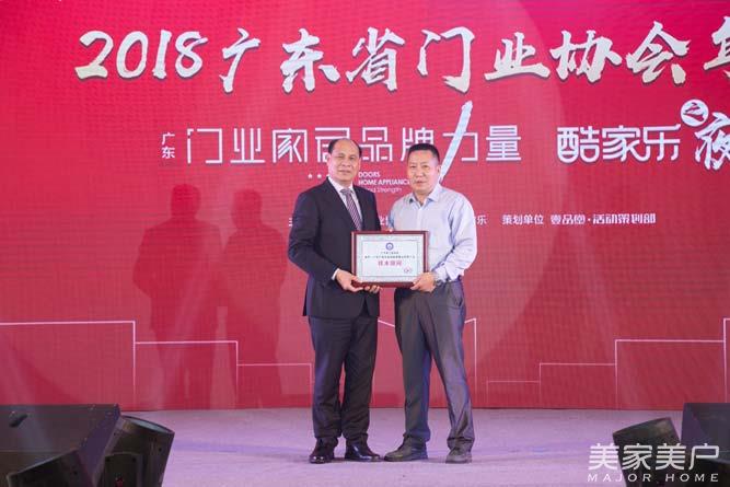 年会上,广东省门业协会会长授予广创木业董事长罗广文技术顾问荣誉牌
