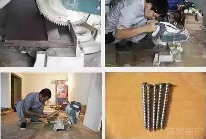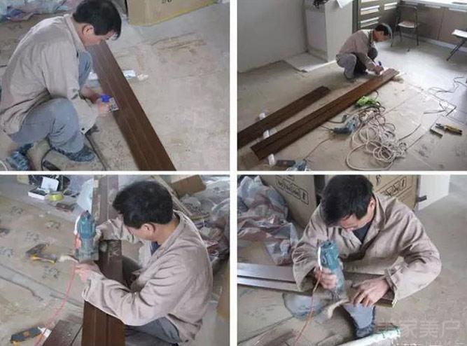 将带直角边的门套线切成45度角,用木工刨修整,直角边插入门套槽内,并用地板胶将门套线与门套板粘牢。
