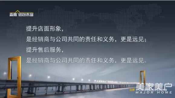 我们要用各种各样的方法让零售的逻辑得以贯彻。九个要素里面我最关注的是提升店面形象和售后服务,这是经销商与公司共同的责任和义务,更是远见。只要我们坚持,持续地投入,让我们的形象高大上,贴近客户的心灵,打动客户,让客户感觉到我们是有文化、有素养、有愿景、有理想的一个品牌,我们才会产生溢价。售后服务也一样,森鹰公司做了很多的工程,工程售后谁来做呢?靠在座的各位,公司要跟你们签约,为你们提供物料和人工费,大家不要觉得工程售后很麻烦,干一干你就知道甜头了,不但让你的工人有收入,关键这里头还能挖掘到一些零售客户,工程零售其实是不分家的,有隐含的诸多的关联机会。我们今生有缘共同创造森鹰这个品牌,森鹰不是老边一个人的,而是我们的经销商、供应商共同的社会财富。所以大家为工程做服务是有账可算的,是划算的,同时做好你们自己客户的售后。售后的费用就当广告费了,在售后方面我们花得太少了,不是我们的产品没有问题,而是客户没有时间搭理我们,它藏在窗帘后面。我们希望能够暴露问题解决问题,那就需要投入,我说一年投1000万我都乐意,只要让客户有好的使用体验。我们要打造一个与众不同的企业,这也是我们打造差异化的一个重要的路径。这是慢功夫,需要长期坚持。