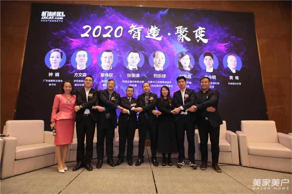 在论坛对话环节中,广东省橱柜业商会秘书长钟娟,顶固全屋定制事业部总经理张俊涛,美尼美家具董事长黎伟权,伊百丽家具副总经理方文森,伦教木工机械商会商会会长刘乐球,佛山市顺德区普瑞特机械制造有限公司总经理付秋霞,广东富全来恩机械有限公司总经理金今明,机械猫总经理黄唯等8位领导嘉宾以“2020智造,聚变”为主题共同探讨行业未来发展路线。