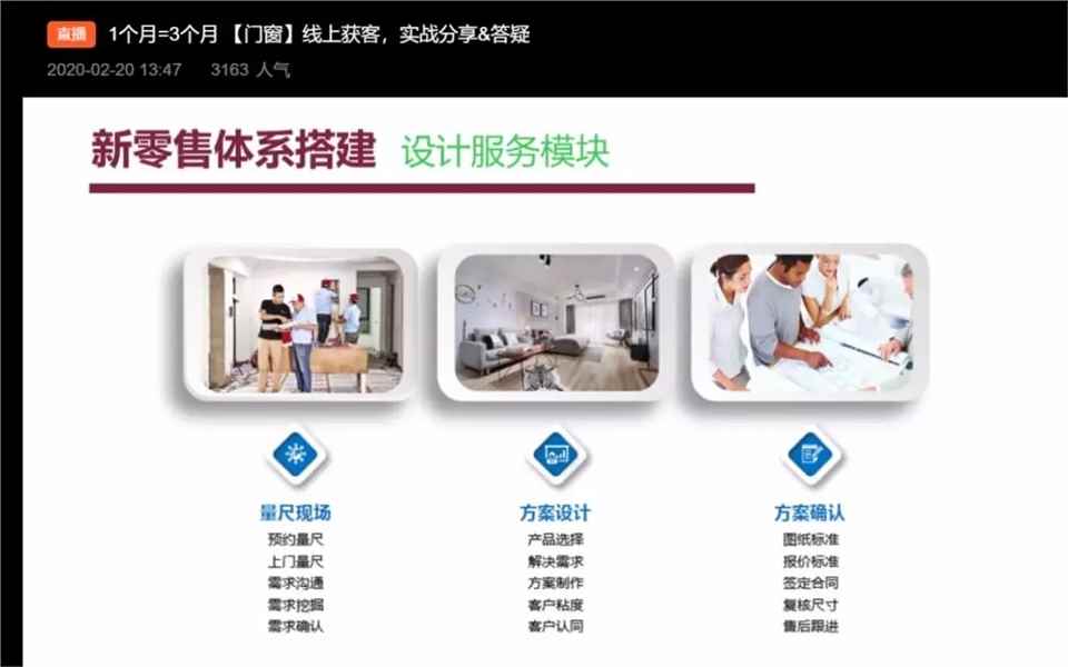 原来各门窗企业和门店受此次突发疫情的影响,复工遭遇重重困难。酷家乐了解到很多门窗企业都想做线上营销,但苦于没思路,没方向,没工具,无从下手,无比焦虑,因此特联合引擎动力、广东省门业协会、中华门窗网,免费推出“门店如何线上获客”主题公益课程系列,帮助门窗企业梳理互联网营销思路,主动破局。活动吸引了上万人在线观看。众多门窗从业者纷纷表示,课程来得太及时了,必须赶紧上线互联网营销。