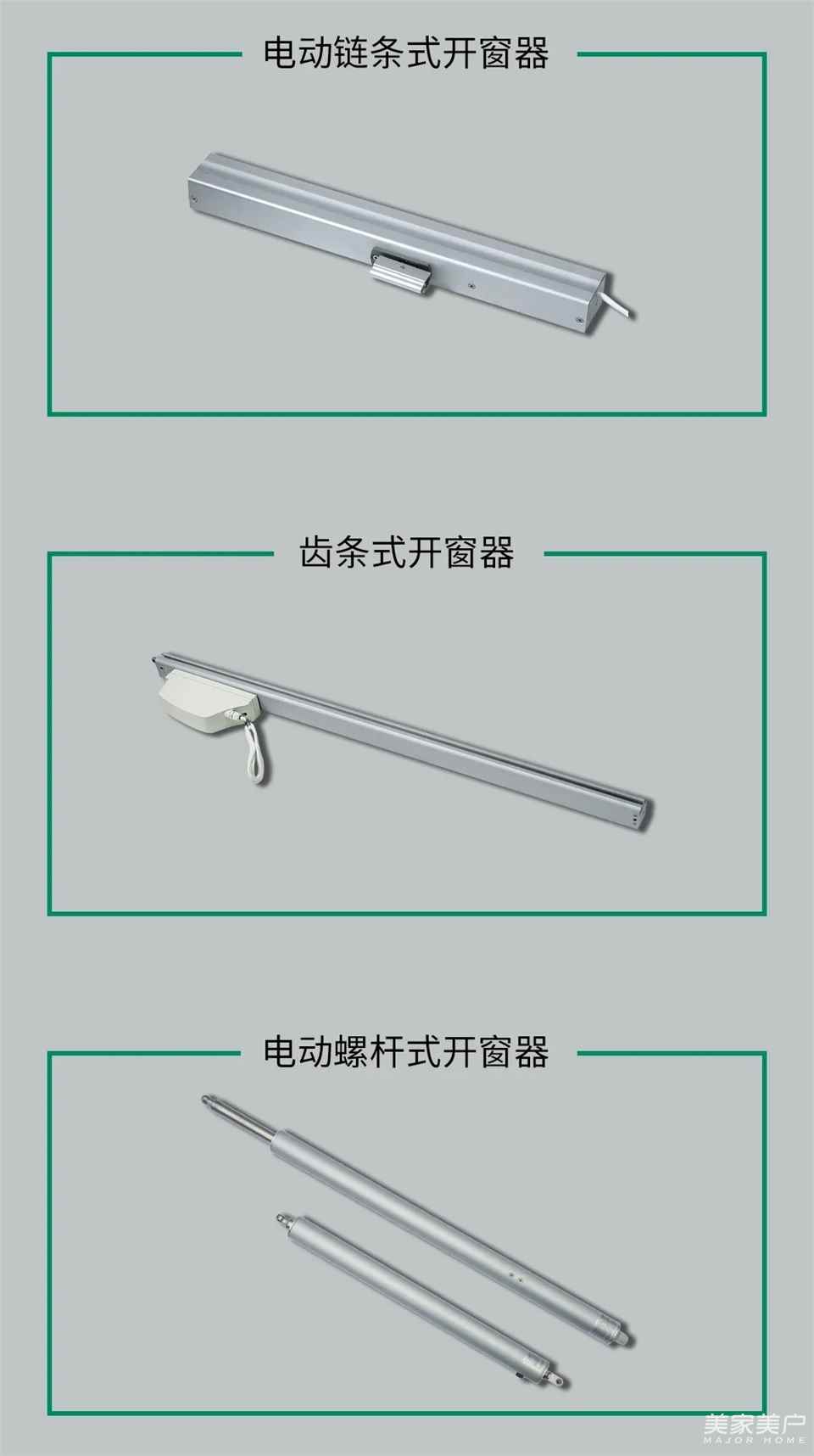 电动开窗器的应用,解决了高层、超高层建筑对高空窗启闭控制的难题。而且,电动开窗器还可以结合建筑楼宇内部环境控制系统及消防预警系统使用,通过自动感应来调节窗扇的启闭或开启大小。日常可自动控制室内湿度、温度及含氧量等环境指标,以提升建筑楼宇内部环境的人居舒适度;另外一旦建筑物发生火警,消防排烟窗可自动开启,从而快速排走室内烟雾及有毒气体,极大地提升建筑的消防安全指数。合和公司的电动开窗器,通过30000次以上的反复开启测试,具有高锁紧力、轻柔闭合的特性。产品类型包括电动链条式开窗器、齿条式开窗器与电动螺杆式开窗器。链条式开窗器主要应用于立面上悬窗、下悬窗、平开窗、平推窗等窗型;齿条式开窗器及螺杆式开窗器主要应用于天窗、上悬窗等窗型。