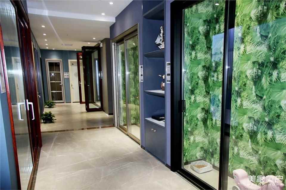 国际馆的时尚元素、线性语言转换为设计的美学意趣所在,表现为规则与不规则艺术蕴味。门窗与墙面采用鲜明的色彩搭配法,大面积采用蓝色的墙面与生态门的色彩形成强烈的视觉冲击,沉稳的色彩运用产生一种宁静的轻奢之感,加深人对店面的记忆点。