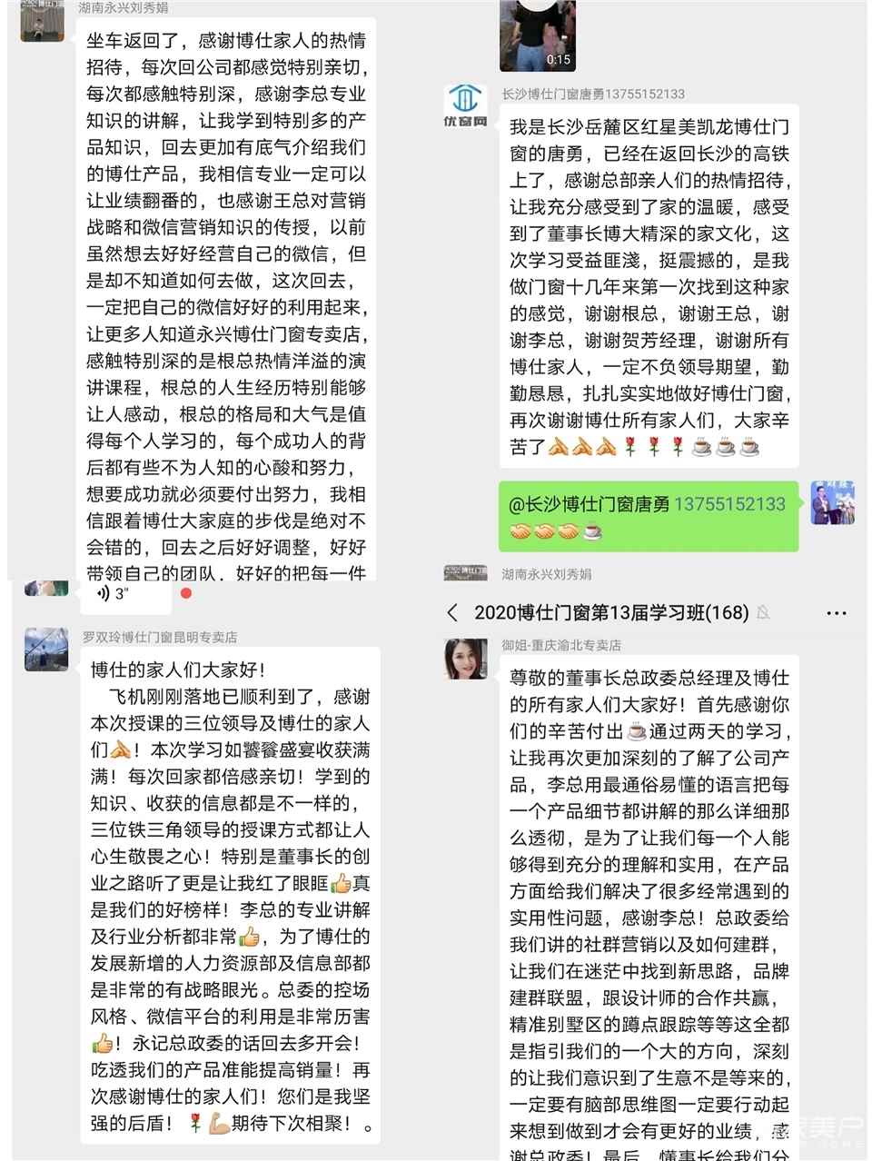 会议结束后,各位经销商也对本次参加学习执行班发表了感言。此次学习之旅也让各位经销商更加切身的感受到博仕门窗无论是产品质量、支持力度还是售后帮扶,都有自己完善的管理制度与体系,更加坚定了与博仕门窗合作发展的信念。