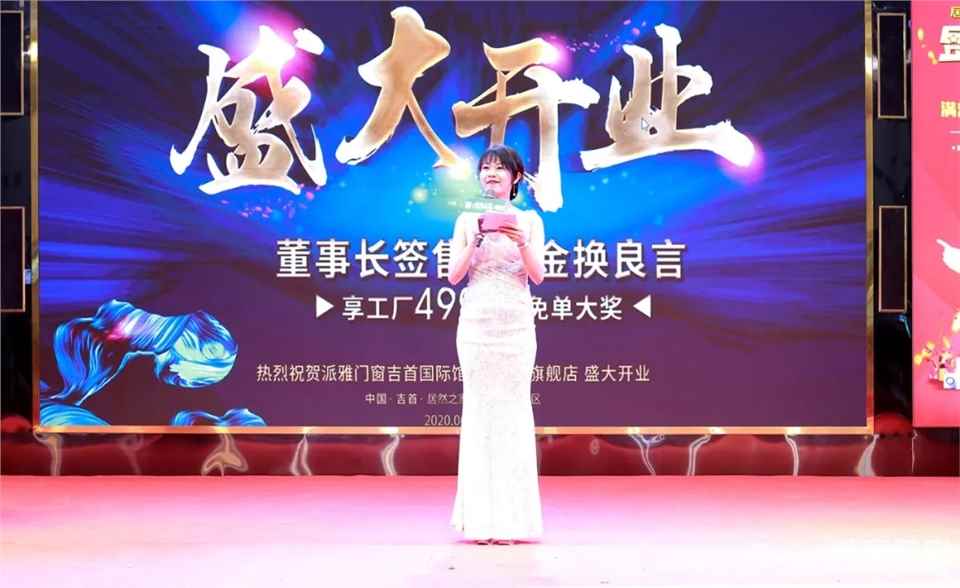 吉首派雅门窗总经理李华先生致辞,今天借着这个机会我要表达三个感谢、三个愿景、三个承诺。感谢派雅总部董事长李钧洪先生、营销总经理陈海全及优秀派雅家人们莅临助阵开业,坐镇助威;感谢居然之家以及商场领导对吉首派雅的鼎力支持,以及派雅新老客户、各界朋友们对派雅门窗的信任。三个愿景为愿派雅门窗总部2020翱翔天际,勇攀高峰,愿吉首派雅门庭若市,繁荣鼎盛;愿新老客户和各界朋友身体健康,万事如意。