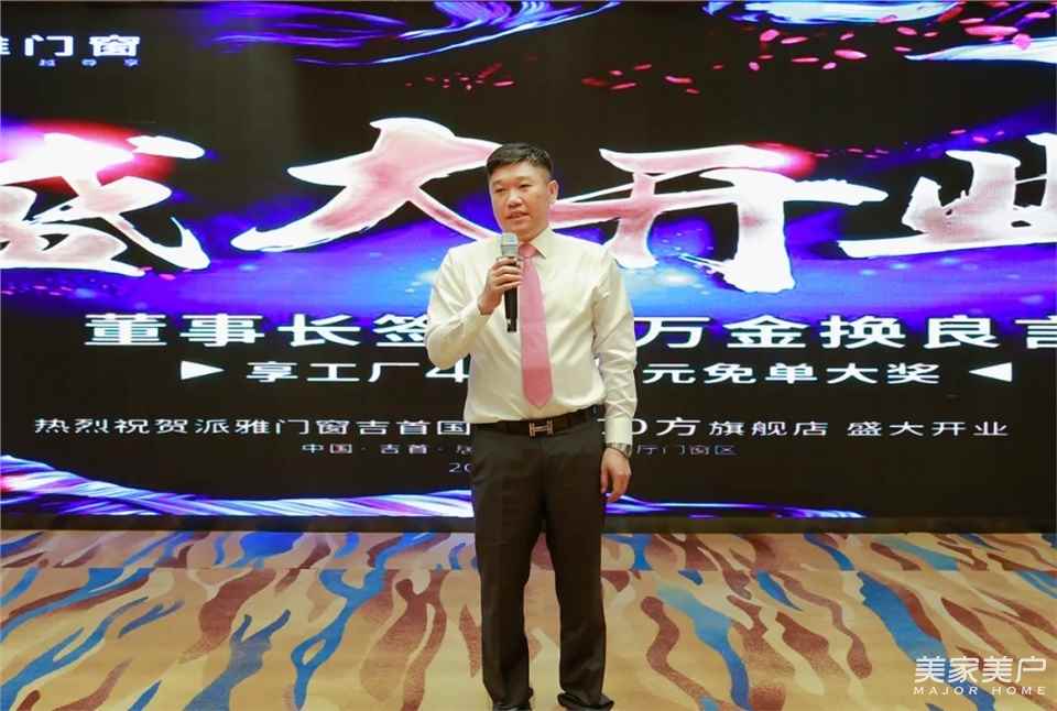 派雅董事长李钧洪先生致辞,代表派雅总部向吉首成功开业表示祝贺,派雅吉首旗舰店的顺利成功开业得到居然之家和广大消费者的支持,在此表示衷心的感谢。吉首旗舰店的开业将进一步把派雅的人居理念带给吉首消费者,把派雅的产品和服务辐射到吉首地区。吉首经销商一贯以坚持诚信、稳健的经营理念,扎扎实实做好服务,多年来深耕细作,使派雅门窗成为吉首的首选品牌,销量节节攀升。我们相信吉首一定能够一如既往地为消费者做好服务,把公司的优质产品带给消费者,成为展示派雅门窗优质产品和高标准的服务操守,用派雅的产品语言为吉首消费者营造个性、时尚、健康的家居理念。我真诚地希望在未来岁月里,在吉首各界朋友们一如既往的支持下,发展目标更加高远。