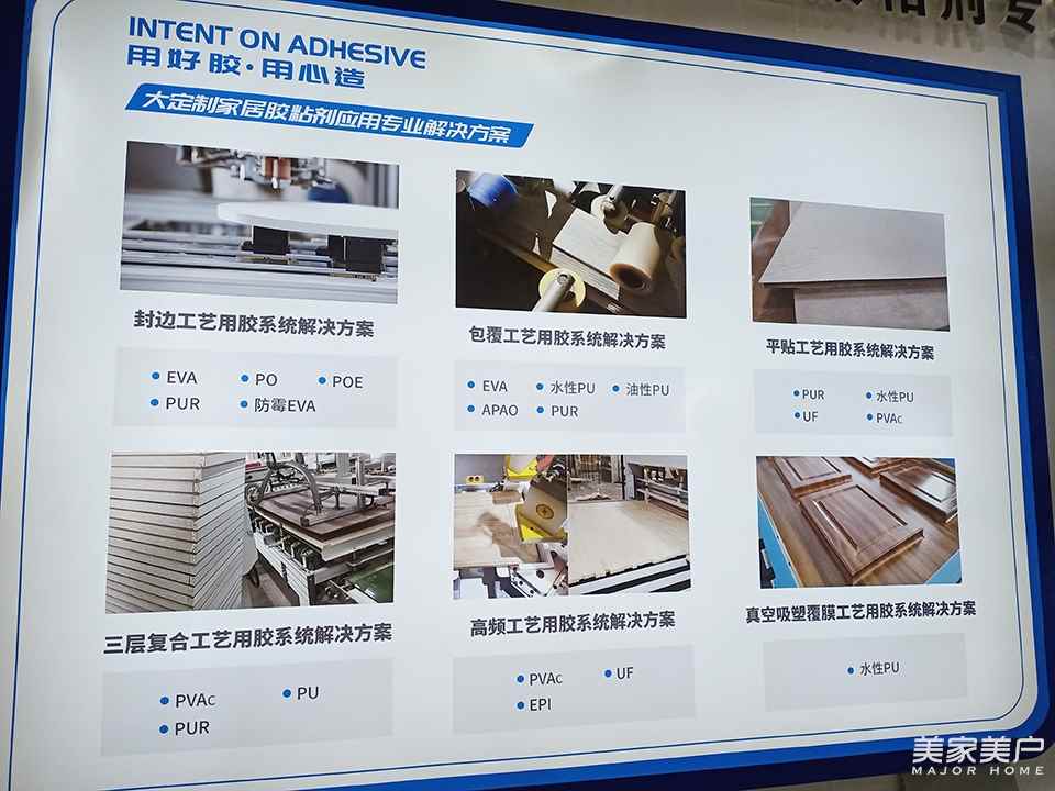 在应用方面,未来胶黏剂生产企业要不断适应智能化生产线的需求,这也是胶黏剂企业的一个发展方向。应用胶水是一个劳动密集型的工序,但是行业的发展要求产品要配合生产线进行改变,这是永特耐的强项。程汉文说:“我们推出了一系列革命性的产品,比如复合AB胶,单组分3分钟快速压合产品,在门业我们的占有率超过95%,在市面上,有这种生产线的或者将上这种生产线的木制品企业95%都会使用永特耐的产品。这是我们近10年来,研发的巨大成果和进步。”