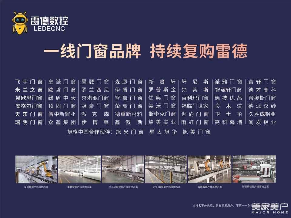 本次展会带来的新品S系列铝门窗智能生产线,采用智能锯铣中心、智能加工中心、智能双头端面铣、工业机器人、智能分拣线、智能四头组角线及整套系统进行协同作业,型材不落地,实现智能化、数字化的生产模式,解决传统工厂交期长、招工难、品质不稳定等一系列问题,采用雷德数控S系列智能生产线年产能可达10万平米,助力门窗企业打造成为全方位的工业4.0生产基地,提高产品竞争力和市场占有率。公司目前已与众多一线门窗品牌达成合作,如:飞宇门窗、皇派门窗、米兰之窗、墨瑟门窗、森鹰门窗、轩尼斯门窗、欧哲门窗、罗兰西尼、新豪轩门窗、富轩门窗等100余家,且已多次复购雷德数控产品。