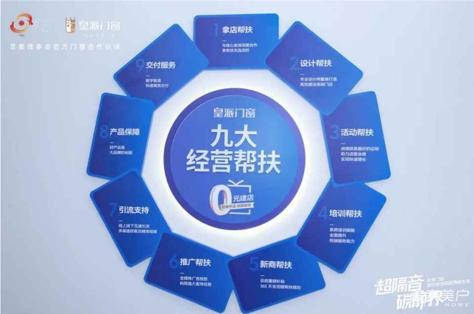 在经营帮扶上,皇派门窗组建专业经营帮扶团队,搭建9大经营帮扶体系,为经销商量身定制365天全流程帮扶规划,通过装修补贴、广告补贴、样板打造专项补贴、促销让利补贴等重磅补贴政策,实打实帮助经销商做大做强,共赢创业财富梦想。