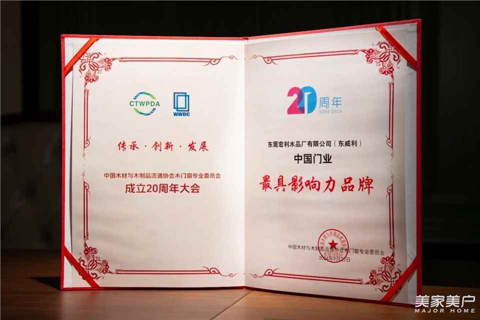 在此次中国木材与木制品流通协会木门窗专业委员会成立20周年大会中东威利荣获中国门业时代功勋、最具影响力品牌、二十年质量服务坚守奖、中国门业大国工匠奖项。