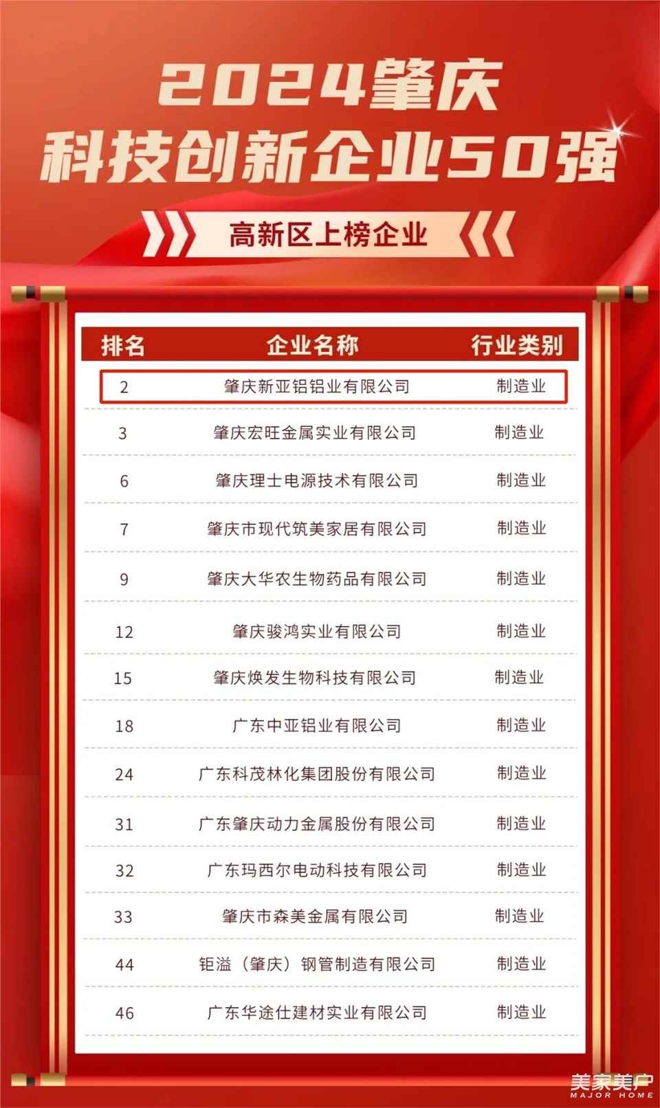其中,坐落于规模化、装备精良的铝加工产业基地“亚铝工业城”内,专注铝产品创新制造的:肇庆新亚铝铝业有限公司、肇庆高新区森原铝业有限公司、肇庆亚洲铝厂有限公司、广东迈科美新能源科技有限公司四家公司均荣登肇庆企业百强前50位!