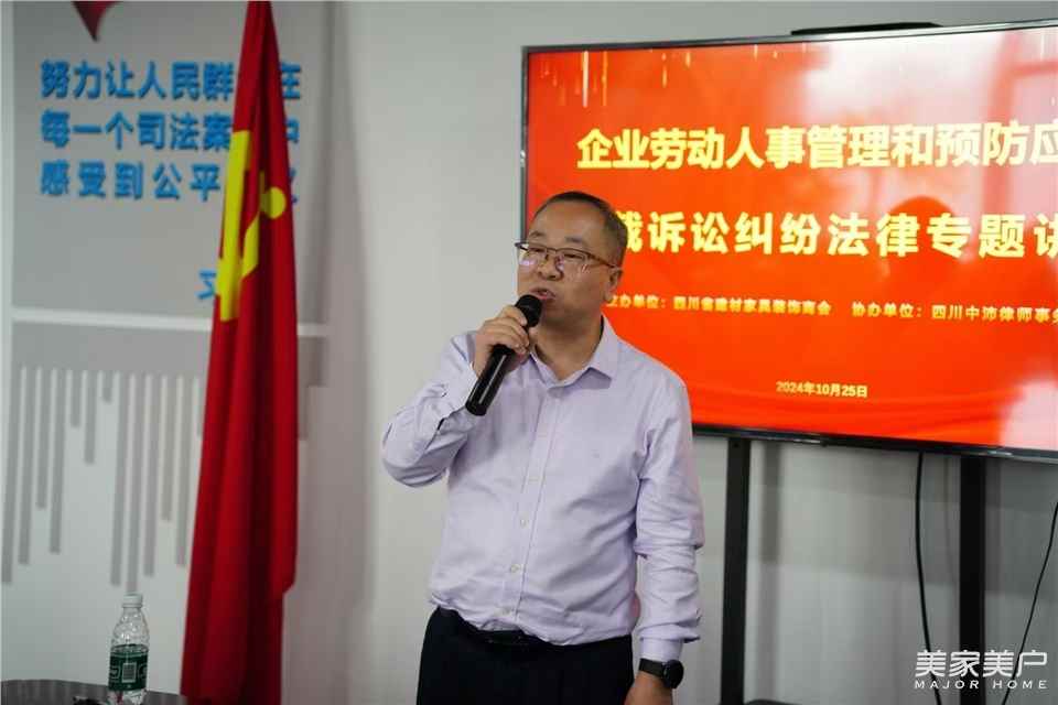 10月25日,由四川省建材家具装饰商会主办、四川中沛律师事务所协办的“企业劳动人事管理和预防应对仲裁诉讼纠纷法律专题讲座”顺利举行。四川省建材家具装饰商会整木定制专委会会长周小军、秘书长冯青山,四川中沛律师事务所主任康健忠以及事务所律师团队、企业代表、媒体代表等参加了本次培训会。