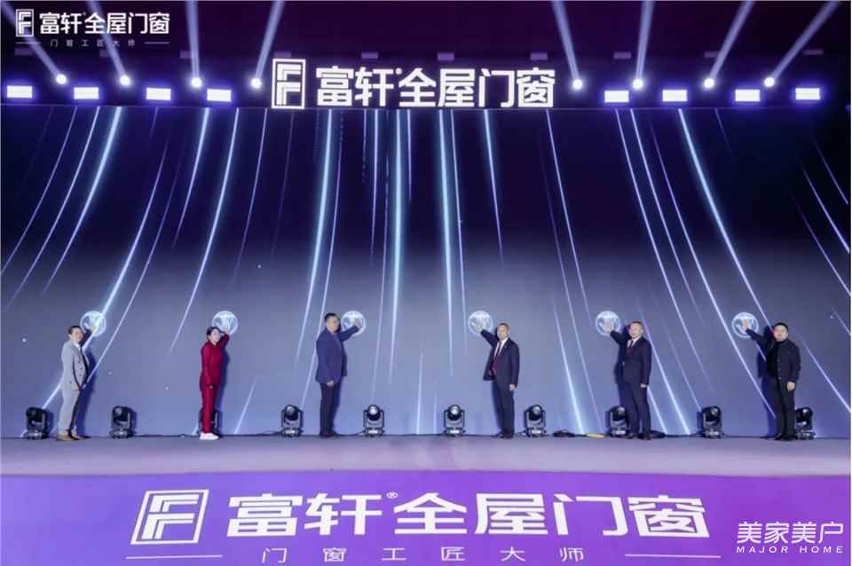 富轩集团董事长李昌安先生、中建协整装定制与门窗幕墙专委会主席周时珍女士、全国建筑幕墙门窗标准化技术委员会顾问王洪涛先生、中国建筑材料流通协会执委副会长李作奇先生、广东网络广播电视台生活频道&房产频道总经理关国栋先生、慧亚家居总经理覃金江先生一同开启门窗服务革命:轩管家2.0 安装交付发布仪式。