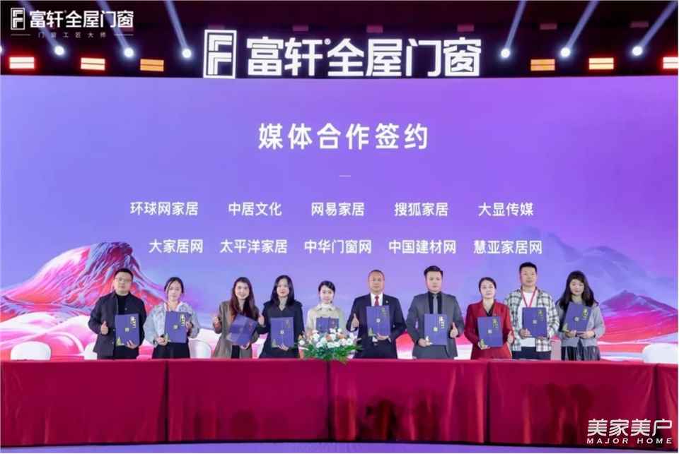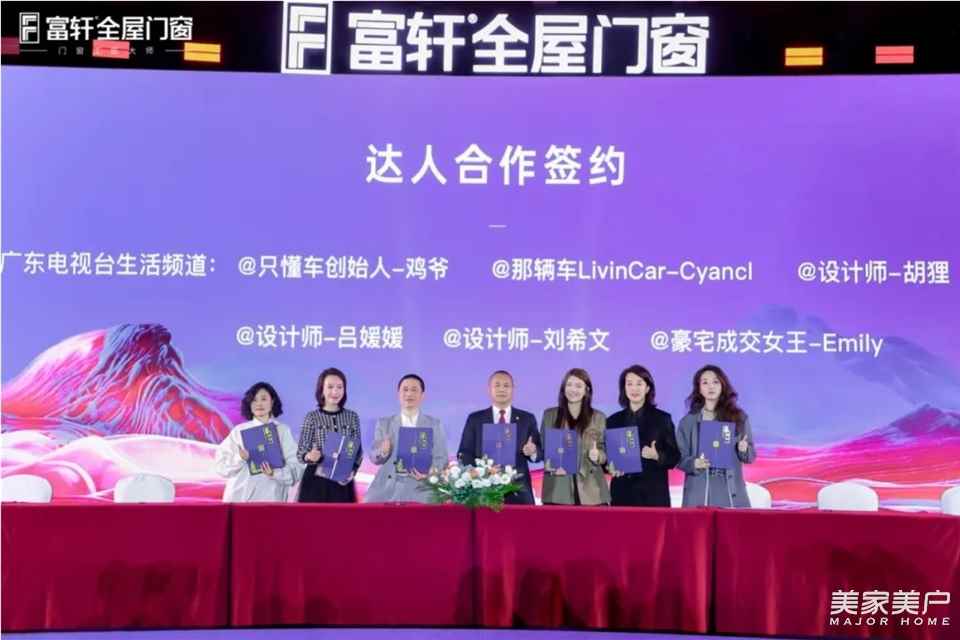 2025年富轩再次重磅出手,与媒体环球网家居、中居文化、网易家居、搜狐家居、广州大显传媒有限公司、大家居网、太平洋家居、中华门窗网、中国建材网、慧亚家居网、进行签约。同时与广东电视台生活频道达人:@豪宅成交女王-Emily 、@那辆车LivinCar-Cyancl 、@汽车博主-花王辉 、@设计师-胡狸 、@设计师-刘希文 、@设计师-吕媛媛 @只懂车创始人-鸡爷签订了战略合作协议,在现有基础上持续深化合作,致力于打造全方位、多渠道的品牌传播与市场推广体系。全面展示创新产品、卓越工艺和优质服务,与消费者建立更加紧密的联系,为消费者提供更加优质、环保、智能的门窗解决方案,引领门窗行业的绿色发展潮流。