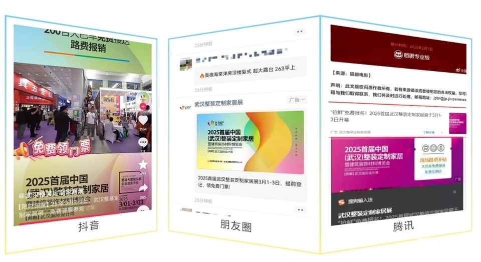 就 2025首届武汉整装定制家居展紧跟时代潮流,积极在抖音、腾讯等热门平台上进行线上投放,建立数据标签,达到1亿次宣传曝光。