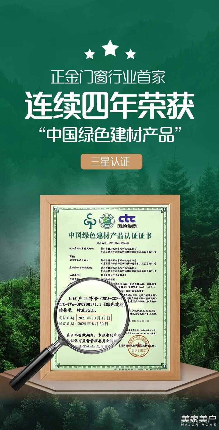连续四年荣获「中国绿色建材产品认证」三星级认证证书,是国家权威机构和行业对正金门窗高品质、绿色低碳效能的充分肯定和认可,这不仅标志着正金门窗产品具有安全、环保、节能、低碳等重要特征,为官方认证的绿色健康建材产品,还成为了正金门窗在品质、口碑、先进性及环保性取得重大实践成果的有力见证。