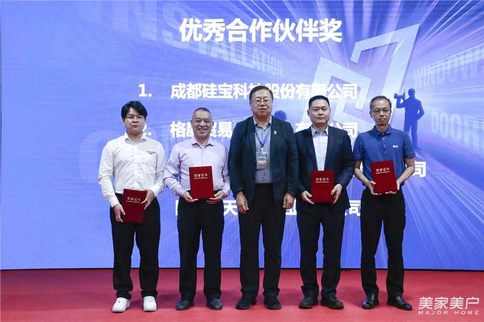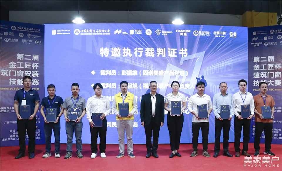在表彰环节,中国建筑金属结构协会检测认证分会会长王洪涛,为成都硅宝、格屋、老赖不赖超安全门窗、固诺颁发了“优秀合作伙伴”荣誉。广东门业协会执行会长徐生,对助力本次大赛的10位裁判员颁发特邀执行裁判证书。