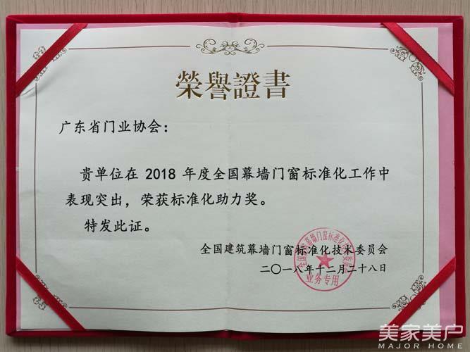 2018年12月28日,在全国建筑幕墙门窗标准化技术委员会年度工作会议上,广东省门业协会因在2018年度全国幕墙门窗标准化工作中表现突出,荣获全国建筑幕墙门窗标准化技术委员会“标准化助力奖”殊荣。同时,广东省门业协会秘书长徐生被聘请为全国建筑幕墙门窗标准化技术委员会观察员。