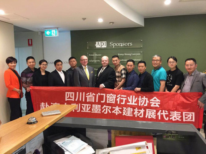 2016年5月2日-10日,由四川省门窗行业协会组织的赴澳大利亚墨尔本国际建材展代表团一行取得圆满成功。本次代表团一行旨在参观澳洲国际建材展会,考察当地大型建材超市,与澳大利亚建筑协会公务座谈。代表团成员有飞宇门窗、旭日门窗、好川科技、锐曦科技、本木木业、全鑫木业、天坝木业、亿升广告、远恒印务、三川喷涂设备等十几家企业。